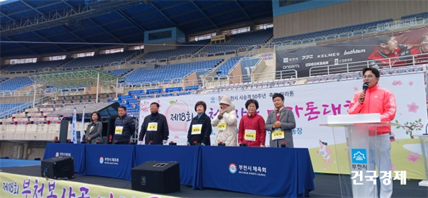 ÇÑÆí, Á¶¿ëÀÍ ºÎõ½ÃÀå, ºÎõ½ÃÀÇȸ(ÃÖ¼º¿î ÀÇÀå) ÀÇ¿ø µî ¸¹Àº Àλ絵 ÇÔ²²ÇÏ¿© ¡°ºÎõ½Ã ½Ã ½Â°Ý 50ÁÖ³âÀ» ¸ÂÀÌÇØ ¿ÃÇØ ¸¶¶óÅæ´ëȸ¿¡ Âü¿©ÇÏ´Â ¿©·¯ºÐµéÀ» ȯ¿µÇÏ¸ç º¹»ç°ñ °÷°÷À» ´Þ¸®¸ç µµÀü°ú ¼ºÃëÀÇ ±â»ÝÀ» ´©¸®°í Ȱ·ÂÀ» ¾ò¾î°¡½Ã±æ ¹Ù¶õ´Ù¡±°í ÀÀ¿ø Çß´Ù.