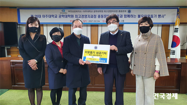 ºÎõ»ó°øÈ¸ÀǼÒ-¾ÆÁÖ´ë °øÇдëÇпø ÃÖ°í°æ¿µÀÚ°úÁ¤ Ãѵ¿¹®È¸(ȸÀå °­±âÈ£)´Â Áö³­ 4ÀÏ, ºÎõ»ó°øÈ¸ÀÇ¼Ò 2Ãþ ÁßȸÀǽǿ¡¼­ ¾î·Á¿î ÀÌ¿ôÀ» µ½±â À§ÇÑ ¼º±Ý Àü´Þ½ÄÀ» °¡Á³´Ù.