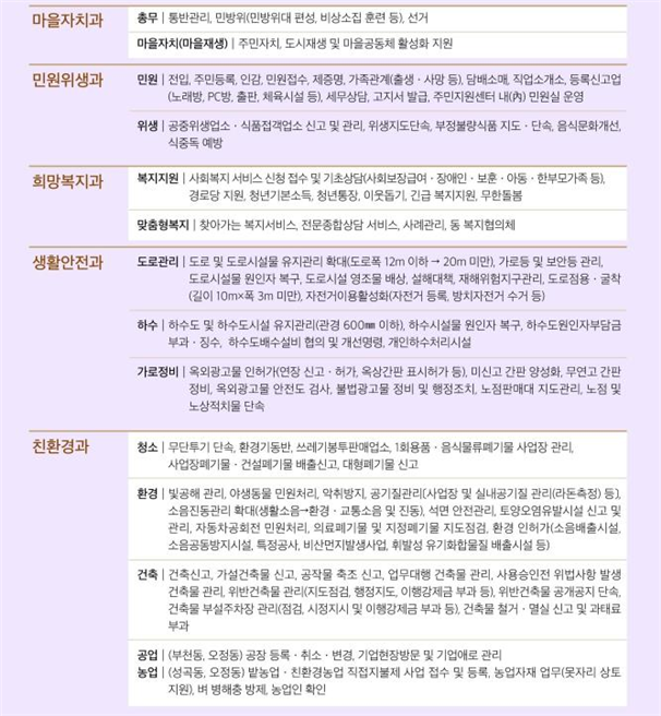 10°³ ±¤¿ªµ¿(ÇàÁ¤º¹Áö¼¾ÅÍ)¿¡´Â º¹Áö, ÀÎÇã°¡ µî 235°³ÀÇ ½Ãû »ç¹«¸¦ ´ëÆø À̰üÇØ ¡®ÀÛÀº ±¸Ã»¡¯ÀÇ ±â´ÉÀ» ÇÏ°Ô µÈ´Ù. ƯÈ÷ °øÀåÁö¿ªÀ» °üÇÒÇÏ´Â ±¤¿ªµ¿¿¡¼­´Â °øÀåµî·Ï, ±â¾÷¾Ö·Î °ü¸® ¾÷¹«¸¦, ³ó¾÷Áö¿ªÀÌ Æ÷ÇÔµÈ ±¤¿ªµ¿¿¡¼­´Â ³ó¾÷ÀÚÀç ¾÷¹«, º­ º´ÇØÃæ ¹æÁ¦, ³ó¾÷ÀÎ È®Àξ÷¹«¸¦ ¼öÇàÇÏ´Â µî ÁÖ°Å¡¤»ó¾÷¡¤°ø¾÷¡¤³ó¾÷ µî Áö¿ªÆ¯¼º¿¡ ¸Â´Â ÇàÁ¤¼­ºñ½º¸¦ Á¦°øÇÑ´Ù.