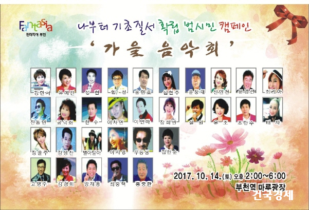 °æ±âÀνŹ®(¹ßÇàÀÎ ÀåÀç¿í)ÀÌ ÁÖ°ü ÇÏ´Â ¾Æ¸§´ä°í ¸ÚÀÖ´Â "°¡À» À½¾Çȸ"°¡ 2017³â 10¿ù 14ÀÏ ¿ÀÈÄ 2½ÃºÎÅÍ "³ªºÎÅÍ ±âÃÊÁú¼­ È®¸³ ¹ü½Ã¹Î Ä·ÆäÀÎ"À» ¼±µµÇÏ´Â Â÷¿ø¿¡¼­ ºÎõ¿ª ¸¶·ç±¤Àå¿¡¼­ ¸¹Àº °¡¼ö¸¦ ÃÊ´ëÇÏ¿© ¿­¸± ¿¹Á¤ÀÌ´Ù.