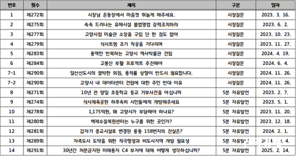 °í¾çƯ·Ê½ÃÀÇȸ ±¹¹ÎÀÇÈû °í´öÈñ ÀÇ¿ø(½Ä»ç ‧ dz»ê ‧ °íºÀ)Àº Áö³ 2025³â 3¿ù 17ÀÏ ÀÇȸ º»È¸ÀÇÀå¿¡¼ ¿¸° Á¦292ȸ ÀÓ½Ãȸ¿¡¼ ¡®°í¾ç½Ã¹ÎÀÇ ¸ñ¼Ò¸®¸¦ ¹Ý¿µÇÏ¿© °í¾ç½Ã¸¦ ¼³°èÇ϶󡯶ó´Â Á¦¸ñÀÇ ½ÃÁ¤Áú¹®À» ÁøÇàÇß´Ù.