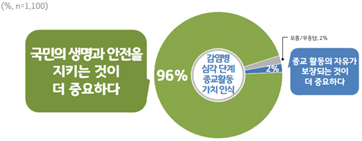 Äڷγª19°¡ È®»êµÇ°í ÀÖ´Â °¨¿°º´ À§±â°æº¸ ¡®½É°¢¡¯ ´Ü°è¿¡¼ÀÇ Á¾±³È°µ¿°ú ¾ÈÀü¿¡ ´ëÇÑ ¹°À½¿¡´Â, ¡®Á¾±³ Ȱµ¿ÀÇ ÀÚÀ¯°¡ º¸ÀåµÇ´Â °Í¡¯(2%) º¸´Ù ¡®±¹¹ÎÀÇ »ý¸í°ú ¾ÈÀüÀ» ÁöŰ´Â °ÍÀÌ ´õ Áß¿äÇÏ´Ù¡¯(96%)´Â ÀÀ´ä °á°ú°¡ ³ª¿Ô´Ù. Á¾±³°¡ ÀÖ´Â µµ¹Î 94%µµ ¡®±¹¹ÎÀÇ ¾ÈÀüÀÌ ´õ Áß¿äÇÏ´Ù¡¯°í ´äÇß´Ù.