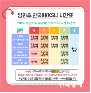 ¼¿ï´Ù¹®È±³À°Áö¿ø¼¾ÅÍ¿¡¼ ¿î¿µÇÏ´Â ¹æ°úÈÄ Çѱ¹¾î±³½ÇÀº ÃʵÁßµî ´Ù¾çÇÑ ¼öÁغ°·Î ¼±ÅÃÇÒ ¼ö ÀÖ°í, ¼¾ÅÍ¿¡ ¹æ¹®ÀÌ ¾î·Á¿î ÇлýÀº ¿Â¶óÀÎ ¼ö¾÷À» ½ÅûÇÒ ¼ö ÀÖ´Ù.