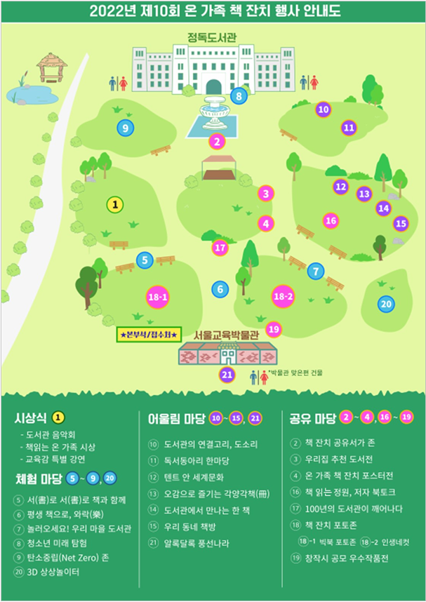 ¿ ¹øÂ°¸¦ ¸ÂÀÌÇÑ ¡¸¿Â °¡Á· Ã¥ ÀÜÄ¡¡¹´Â ¸ð¹üÀûÀ¸·Î µµ¼°üÀ» ÀÌ¿ëÇÑ µ¶¼ °¡Á·µéÀ» °Ý·ÁÇϰí, °¡Á· ´ÜÀ§ µµ¼°ü ÀÌ¿ëÀÚµéÀÇ µ¶¼»ýȰ ÁõÁøÀ» À§ÇØ ¼¿ïƯº°½Ã±³À°Ã» µµ¼°ü°ú Æò»ýÇнÀ°ü ÁÖ°üÀ¸·Î ¸Å³â ¿¸®°í ÀÖ´Ù.