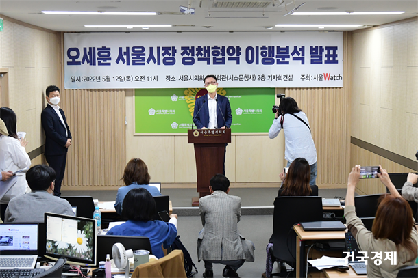 °æ½Ç·ÃÀº ÀÛ³â 4¡¤7 ¼¿ï½ÃÀå º¸±È¼±°Å ´ç½Ã ¿À¼¼ÈÆ Èĺ¸¿¡°Ô ¼¿ï½ÃÀÇ º¯È¸¦ À§ÇÑ 5´ë ºÐ¾ß 17°³ Á¤Ã¥°úÁ¦¸¦ Á¦¾ÈÇß´Ù. ÀÌ Áß ¿À ½ÃÀåÀº 14°³ °úÁ¦¿¡ µ¿ÀÇÇѹÙ, ÀÌÈÄ °æ½Ç·ÃÀº Àü¹®ºÐ¾ß Æò°¡À§¿øÈ¸¸¦ ±¸¼ºÇÏ°í °¢ °úÁ¦º° ½ÇÀû¿¡ ´ëÇÑ Æò°¡¸¦ ÁøÇàÇß´Ù. º» ±âÀÚȸ°ßÀº ¿À ½ÃÀåÀÇ °ø¾à ÀÌÇà ½ÇÀûÀ» ¹ßÇ¥ÇÏ´Â ÀÚ¸®·Î ÁøÇàµÆ´Ù.