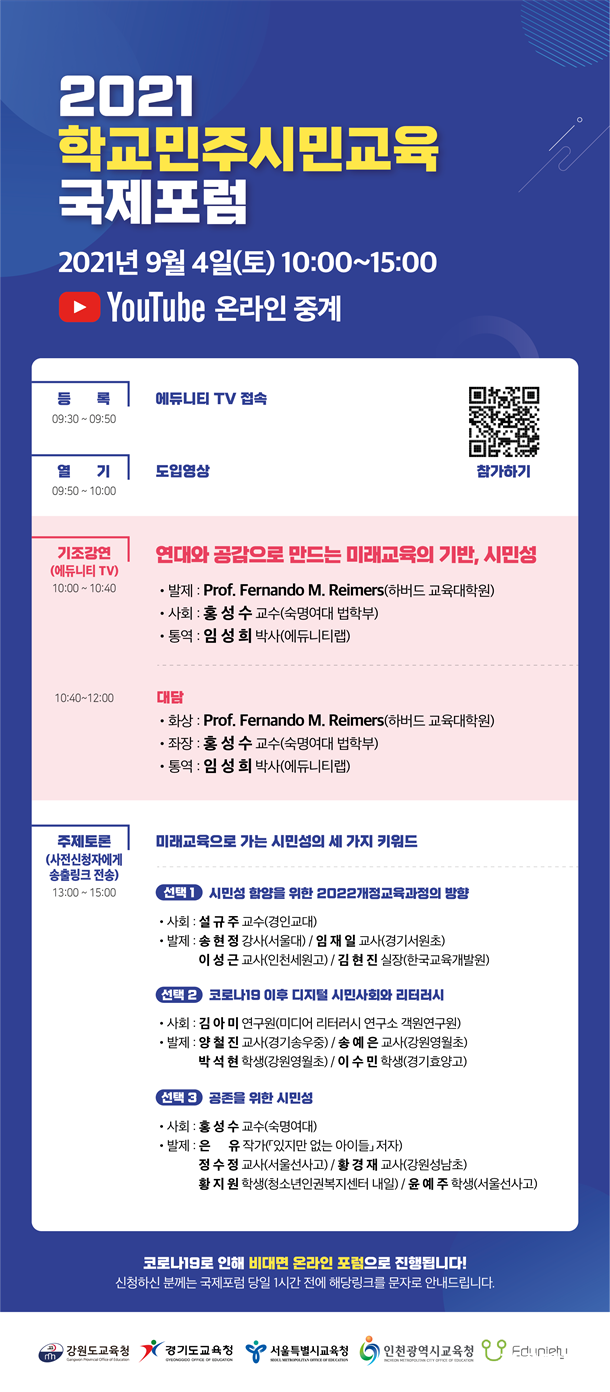 ±¹Á¦Æ÷·³Àº ¡®Äڷγª19 ½Ã´ë¸¦ °Ç³Ê´Â ¹æ¹ý, ½Ã¹Î¼º¡¯À» ÁÖÁ¦·Î 1ºÎ ±âÁ¶°¿¬À¸·Î Æä¸£³µµ ¿¥ ¶óÀ̸ӽº(Fernando M. Reimers ÇϹöµå ±³À°´ëÇпø)±³¼ö°¡ °¿¬Çϰí È«¼º¼ö ¼÷¸í¿©´ë ±³¼ö°¡ ÁÂÀåÀ» ¸Ã¾Æ ´ë´ãÀ» ÁøÇàÇÑ´Ù. 2ºÎ´Â ¡â½Ã¹Î¼º ÇÔ¾çÀ» À§ÇÑ 2022 °³Á¤±³À°°úÁ¤ÀÇ ¹æÇâ ¡âÄڷγª19 ÀÌÈÄ µðÁöÅÐ ½Ã¹Î»çȸ¿Í ¸®ÅÍ·¯½Ã ¡â°øÁ¸À» À§ÇÑ ½Ã¹Î¼ºÀ̶ó´Â ³»¿ëÀ» Áß½ÉÀ¸·Î Âü°¡ÀÚ°¡ ¼±ÅÃÇØ Âü¿©ÇÏ´Â ÁÖÁ¦Åä·ÐÀ» ÁøÇàÇÑ´Ù.