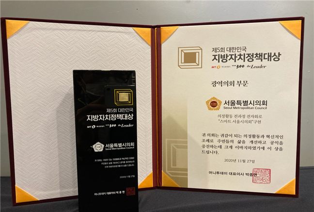 ¼­¿ïƯº°½ÃÀÇȸ(ÀÇÀå ±èÀÎÈ£)´Â 2020³â 11¿ù 27ÀÏ(±Ý) ¸Ó´ÏÅõµ¥À̰¡ ÁÖÃÖ ÇÏ´Â Á¦5ȸ ´ëÇѹα¹ Áö¹æÀÚÄ¡ Á¤Ã¥´ë»ó¡¸ÀÇÁ¤ºÎ¹®¡¹À» ¼ö»óÇÏ¿´´Ù.¡¸´ëÇѹα¹ Áö¹æÀÚÄ¡ Á¤Ã¥´ë»ó¡¹Àº Áö¹æÀÚÄ¡´ÜüµéÀÇ Çõ½ÅÁ¤Ã¥À» ¹ß±¼ÇÏ°í ½Ã»óÇÏ¿©, ¡®¸ð¹ü»ç·Ê¡¯µéÀÌ È®»ê µÇµµ·Ï ±â¿©Çϰí ÀÖÀ¸¸ç, ƯÈ÷ ¿ÃÇØ´Â¡¸ÀÇÁ¤ºÎ¹®¡¹À» ½Å¼³ÇÏ¿© Çõ½ÅÀûÀÎ Á¤Ã¥ ¹× Â÷º°ÀûÀÎ ÀÇȸ¿î¿µ »ç·Ê µîÀ» ¼±¹ßÇÏ¿© ½Ã»óÇÏ¿´´Ù