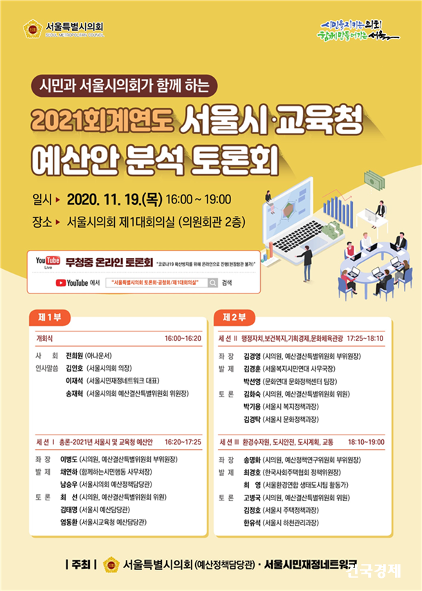 ¼­¿ïƯº°½ÃÀÇȸ´Â 2020³â 11¿ù 19ÀÏ(¸ñ) ¿ÀÈÄ 4½ÃºÎÅÍ ¼­¿ï½ÃÀÇȸ(Á¦1´ëȸÀǽÇ)¿¡¼­¡¸½Ã¹Î°ú ¼­¿ï½ÃÀÇȸ°¡ ÇÔ²²ÇÏ´Â 2021ȸ°è¿¬µµ ¼­¿ï½Ã±³À°Ã» ¿¹»ê¾È ºÐ¼®Åä·Ðȸ¡¹¸¦ ½Ã¹Î´ÜüÇùÀÇüÀÎ ¼­¿ï½Ã¹ÎÀçÁ¤³×Æ®¿öÅ©¿Í °øµ¿À¸·Î °³ÃÖÇÑ´Ù.