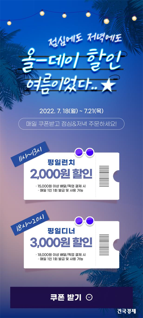 ¸ÕÀú ¡®ÆòÀÏ·±Ä¡ ÄíÆù¡¯Àº 1¸¸5,000¿ø ÀÌ»ó À½½Ä ÁÖ¹®(¹è´Þ/ÇȾ÷) ½Ã 2,000¿øÀ» ÇÒÀιÞÀ» ¼ö ÀÖ´Â ÄíÆùÀ¸·Î, Á¡½É ½Ä»ç ½Ã°£´ëÀÎ ¿ÀÀü 11½ÃºÎÅÍ ¿ÀÈÄ 1½Ã±îÁö »ç¿ëÇÒ ¼ö ÀÖ´Ù.