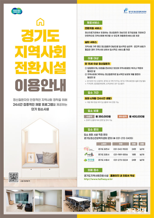 ½Ã¼³ ÀÔ¼Ò´Â Á¤½ÅÀÇ·á±â°ü, Á¤½Å¿ä¾ç½Ã¼³ µî Á¾»çÀÚÀÇ °æ¿ì Áö¿ª»çȸÀüȯ½Ã¼³ ´©¸®Áý(http://www.halfway.or.kr/)À» ÅëÇØ ÀÇ·Ú °¡´ÉÇϸç, Á¤½ÅÁúȯÀÚ¿Í °¡Á·Àº ½Ã¼³(¼ö¿ø ¿ì¸®¸¶À» 031-273-0224, ±èÆ÷ ¹Ù¶÷½£ 031-989-5556, Æ÷õ ¶ó¿Â 031-542-9500)¿¡ ¹®ÀÇÇÏ¸é ¾È³»¹ÞÀ» ¼ö ÀÖ´Ù.