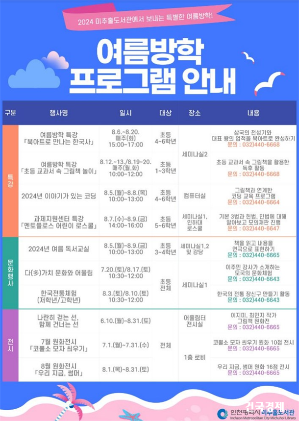 ÀÎõ±¤¿ª½Ã ¹ÌÃßȦµµ¼­°üÀº ¿©¸§¹æÇÐÀ» ¸ÂÀÌÇØ µ¶¼­±³½Ç, ¹æÇÐÆ¯°­ µî ´Ù¾çÇÑ °­Á ¹× ¹®È­Çà»ç¸¦ ¿î¿µÇÑ´Ù°í ¹àÇû´Ù.