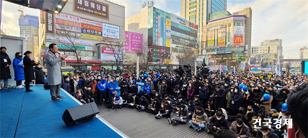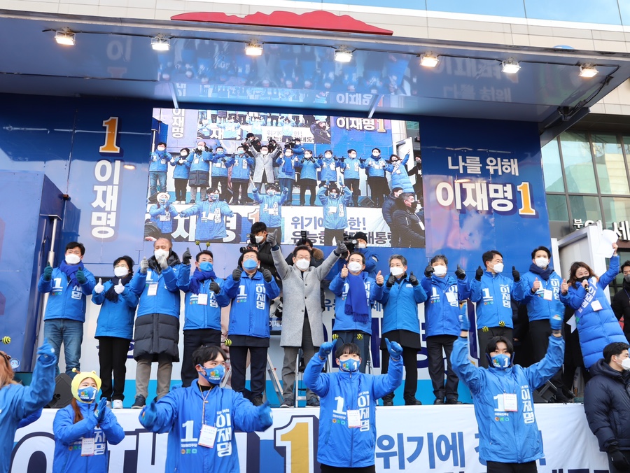 ÀÌÀç¸í ´õºÒ¾î¹ÎÁÖ´ç ´ë¼± È帰¡ 2022³â 2¿ù 22ÀÏ ºÎõ¿ª ¸¶·ç±¤Àå¿¡¼­ À¯¼¼¸¦ °®°í "°æ±âµµ¸¦ ³Ñ¾î Àü ¼¼°è°¡ ºÎ·¯¿öÇÏ´Â ´ëÇѹα¹ ¸¸µé°Ú´Ù"¸ç ÁöÁö¸¦ ´çºÎ Çß´Ù.