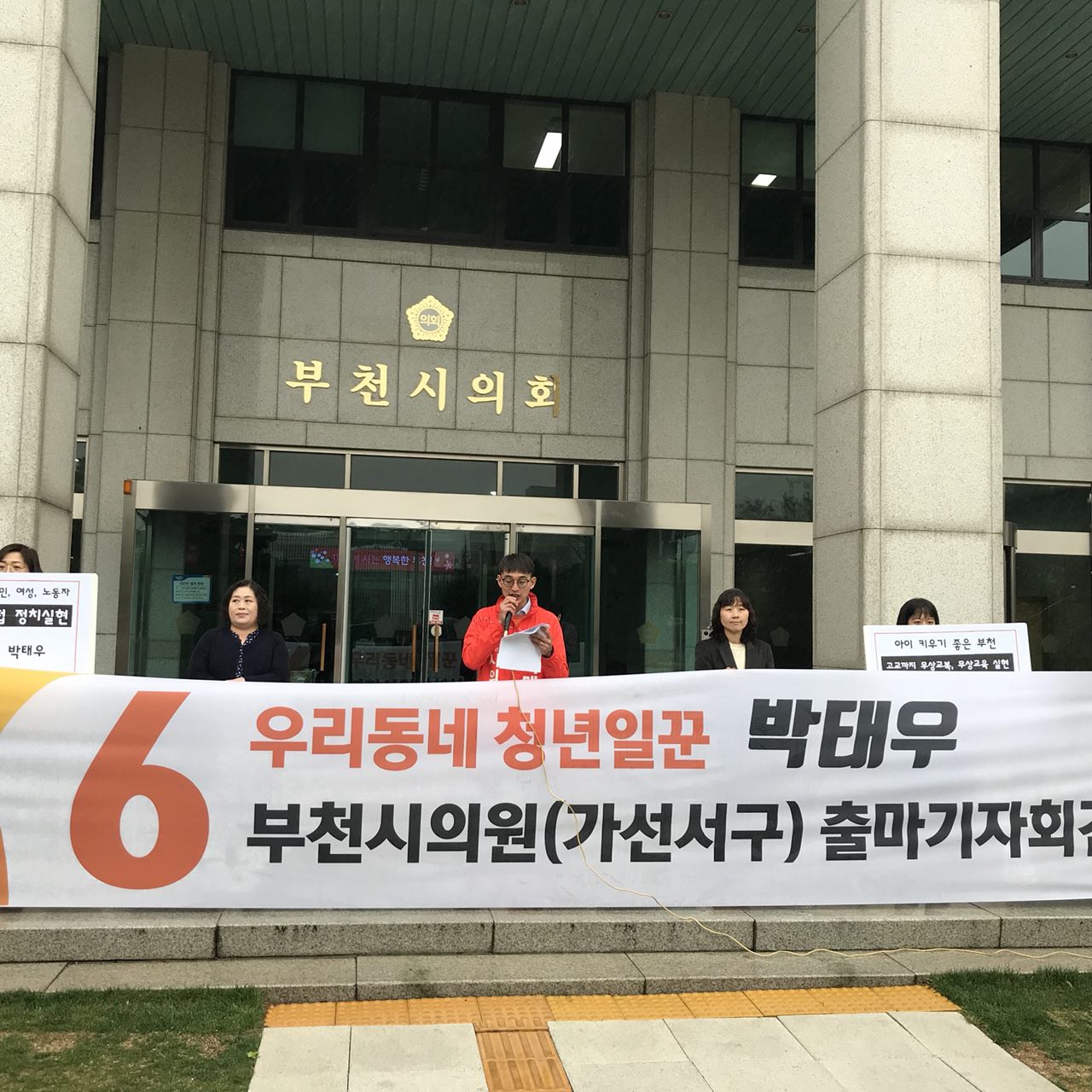 2018³â 6¿ù 13ÀÏ ½Ç½ÃÇÏ´Â Á¦7ȸ Àü±¹µ¿½ÃÁö¹æ¼±°Å¿¡ ºÎõ½ÃÀÇ¿ø È帷ΠÃ⸶Çϱâ À§ÇØ ¹ÎÁß´ç ¹ÚÅÂ¿ì ¿¹ºñÈĺ¸(°¡¼±°Å±¸)°¡ 2018³â 4¿ù 5ÀÏ ºÎõ½ÃÀÇȸ Á¤¹® ¾Õ¿¡¼­ Ã⸶±âÀÚȸ°ßÀ» ÁøÇàÇÏ¿´´Ù.