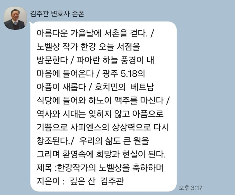 ÇѰ­ ÀÛ°¡ÀÇ 2024³â ³ëº§¹®Çлó ¼ö»óÀ» ÃàÇÏ Çϸç 2024³â 10¿ù 19ÀÏ ±èÁÖ°ü º¯È£»ç(½ÃÀÎ)´Â ÃàÇÏÀÇ ±Û°ú ÇÔ²² ÇÑÀÛ°¡¿Í ¾ÆµéÀÌ °øµ¿ ¿î¿µ ÇÏ´Ù°í ¾Ë·ÁÁø 'Ã¥¹æ ¿À´Ã' ¹æ¹®ÇÏ¿© ÇÑÀÛ°¡ÀÇ Á¤Ã븦 °£Á¢ÀûÀ¸·Î ±â³ä Çß´Ù.