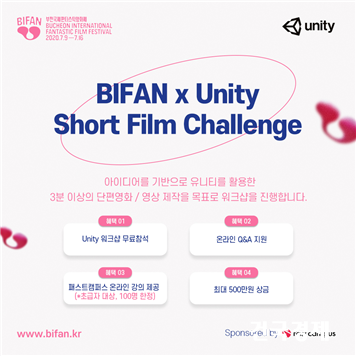 Á¦24ȸ ºÎõ±¹Á¦ÆÇŸ½ºÆ½¿µÈ­Á¦(BIFAN, ÁýÇàÀ§¿øÀå ½Åö)´Â ¼ºÀα³À° ½ºÅ¸Æ®¾÷ ÆÐ½ºÆ®Ä·ÆÛ½º(´ëÇ¥ À̰­¹Î)¿Í ÇÔ²² À¯´ÏƼ(Unity) Ȱ¿ë¹ý¿¡ ´ëÇÑ ¿Â¶óÀÎ °­ÀǸ¦ ÈÄ¿øÇÑ´Ù. ¡®BIFAN x Unity Short Film Challenge¡¯ Áö¿øÀÚ Áß À¯´ÏƼ ÀÔ¹® ´Ü°è 100¸íÀ» ´ë»óÀ¸·Î À¯´ÏƼ ±â¼úÀ» ½ÀµæÇÒ ¼ö ÀÖ´Â ±âȸ¸¦ Á¦°øÇÑ´Ù.