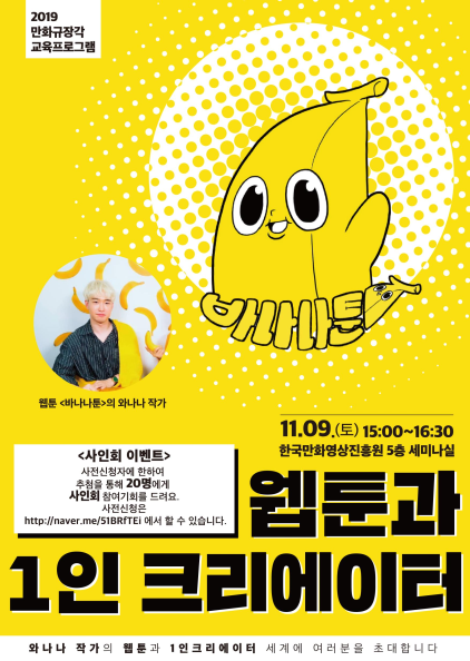 Çѱ¹¸¸È¿µ»óÁøÈï¿ø(¿øÀå ½ÅÁ¾Ã¶, ÀÌÇÏ ÁøÈï¿ø)ÀÌ ¿À´Â 11¿ù 9ÀÏ(Åä) ¿ÀÈÄ 3½Ã ÁøÈï¿ø 5Ãþ ¼¼¹Ì³ª½Ç¿¡¼ Àαâ À¥Å÷ <¹Ù³ª³ªÅ÷>ÀÇ ¿Í³ª³ª ÀÛ°¡¸¦ ÃÊû, ¸¸ÈÀι®ÇÐ °¿¬À» ÁøÇàÇÑ´Ù.
