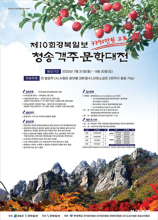¡®Á¦10ȸ °æºÏÀϺ¸ û¼Û°´ÁÖ¹®ÇдëÀü¡¯Àº ±¹³»¿Ü ¹®ÀÎ ¹× ¹®ÇÐ Áö¸Á»ý µîÀ» ´ë»óÀ¸·Î 7¿ù 31ÀϺÎÅÍ 9¿ù 30ÀϱîÁö 2°³¿ù°£ ÀÚÀ¯ ÁÖÁ¦ÀÇ ½Ã¡¤¼öÇÊ¡¤´ÜÆí¼Ò¼³À» °ø¸ðÇÑ´Ù.