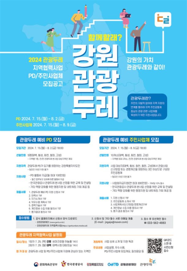 °¿øÆ¯º°ÀÚÄ¡µµ¿Í °¿ø°ü±¤Àç´Ü(´ëÇ¥ÀÌ»ç ÃÖ¼ºÇö)ÀÌ ¡®2024 °¿ø °ü±¤µÎ·¹ Áö¿ªÇù·Â»ç¾÷¡¯¿¡ Âü¿©ÇÒ ½Å±Ô PD¿Í Áֹλç¾÷ü¸¦ ¸ðÁýÇÑ´Ù.