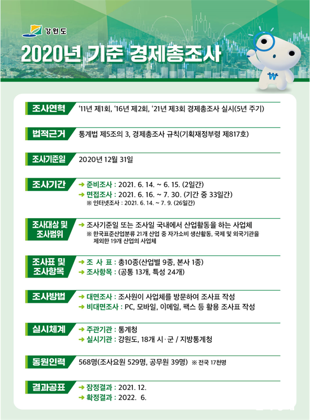 °¿øµµ´Â ¿À´Â 6¿ù 14ÀϺÎÅÍ 7¿ù 30ÀϱîÁö 2020 ±âÁØ °æÁ¦ÃÑÁ¶»ç¸¦ ½Ç½ÃÇÑ´Ù. °æÁ¦ÃÑÁ¶»ç´Â ¸Å 5³â¸¶´Ù ½Ç½ÃµÇ´Â ¹ü±¹°¡ÀûÀÎ ´ë±Ô¸ð Á¶»ç·Î ¿ì¸® °æÁ¦ÀÇ ¿ª»ç°¡ µÇ´Â »Ñ¸® Åë°è·Î ±× Á߿伺ÀÌ ¸Å¿ì ³ôÀ¸¸ç ±¹°¡ ¹× Áö¹æÀÚÄ¡´ÜüÀÇ °æÁ¦Á¤Ã¥À» ¼ö¸³Çϴµ¥ Áß¿äÇÑ ±âÃÊÀÚ·á·Î Ȱ¿ëµÈ´Ù.