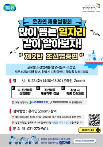 Á¶¼±¾÷Á¾ ¿Â¶óÀΠä¿ë¼³¸íȸ´Â Á¶¼±¾÷Á¾ Á÷Á¾ ¼³¸íȸ¸¦ ÅëÇØ µµ³» ÀÏÀÚ¸®¼¾ÅÍ, ÀÏÀÚ¸® °ü·Ã À¯°ü±â°ü Á÷¾÷»ó´ã»çÀÇ ¿ª·®À» °­È­Çϰí Á¶¼±¾÷ ºÐ¾ß Ãë¾÷¿¡ °ü½É ÀÖ´Â µµ¹ÎÀÇ ±¸Á÷À» Ȱ¼ºÈ­Çϱâ À§ÇØ ¸¶·ÃµÆ´Ù.